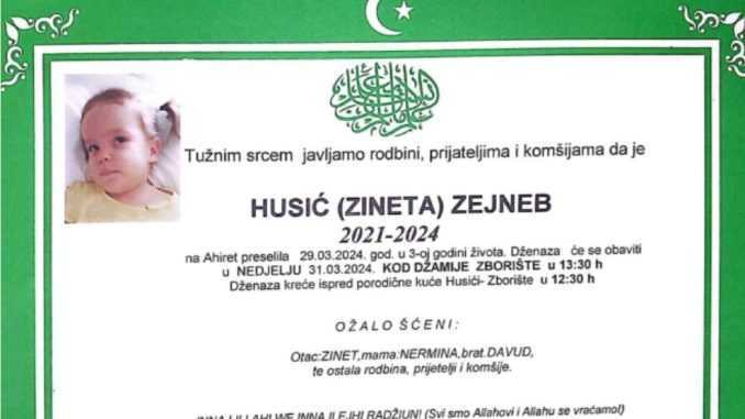 Velika tuga pogodila je Veliku Kladušu, tačnije mjesto Zborište nakon vijesti da ih je zauvijek napustila malena Zejneb Husić (3), piše 072info.