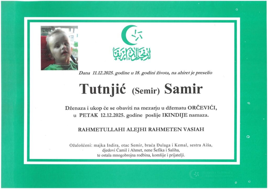 Na ahiret je 11. decembra 2025. godine preselio Samir Tutnjić, mladić koji je tek trebao zakoračiti u život, u 18. godini.