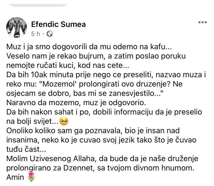 -Muz i ja smo dogovorili da mu odemo na kafu… Veselo nam je rekao bujrum, a zatim poslao poruku nemojte ručati kuci, kod nas cete… Da bih 10ak minuta prije nego ce preseliti, nazvao muza i reko mu: “Mozemol’ prolongirati ovo druzenje? Ne osjecam se dobro, bas mi se zanesvjestilo…” Naravno da mozemo, muz je odgovorio. Da bih nakon sahat i po, dobili informaciju da je preselio na bolji svijet… Onoliko koliko sam ga poznavala, bio je insan nad insanima, neko ko je cuvao svoj jezik tako što je čuvao tuđu čast… Molim Uzivesenog Allaha, da bude da je naše druženje prolongirano za Dzennet, sa tvojom divnom hnumom. Amin- napisala je Sumea na Facebook profilu.