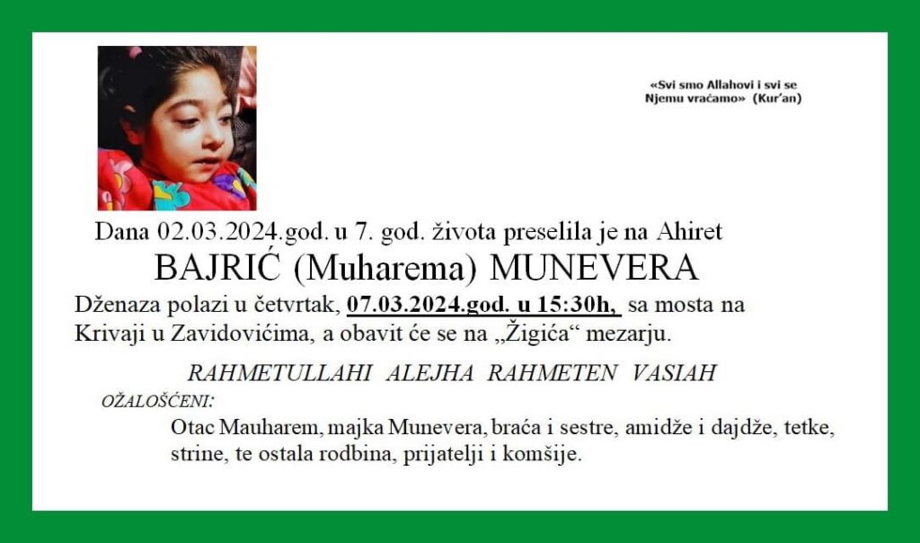 Zavidovići su okovani velikom tugom nakon vijesti da ih je zauvijek napustila malena Munevera Bajrić, piše 072info.