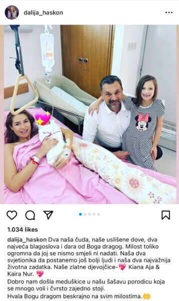“Dva naša čuda, naše uslišene dove, dva najveća blagoslova i dara od Boga dragog. Milost toliko ogromna da joj se nismo smjeli ni nadati. Naša dva svjetionika da postanemo još bolji ljudi i naša dva najvažnija životna zadatka. Naše zlatne djevojčice – Kiana Aja & Kaira Nur.