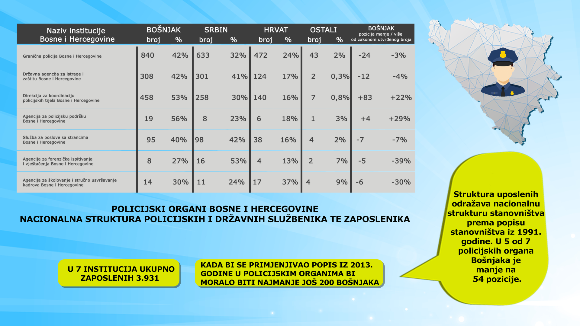 U Direkciji za koordinaciju policijskih tijela Bosne i Hercegovine i Agenciji za policijsku podršku Bosne i Hercegovine Bošnjaka je više nego što zakon propisuje, ali to ne umanjuje podatak da ih nedostaje 54 u ostalih pet policijskih organa, jer se nacionalna struktura policijskih i državnih službenika i zaposlenika odnosi za svaki pojedini organ.