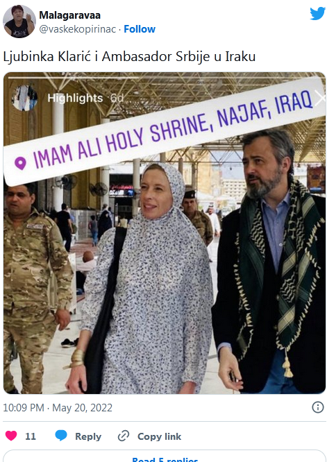 Na fotografiji koja stoji i na profilu srbijanskog ambasadora, možemo vidjeti njih dvoje u Iraku, a Ljubinka je obukla hidžab, kako bi bila u skladu sa njihovim tradicionalnim načinom ženskog odjevanja, dok je ambasador imao na sebi sako, farmerke i poseban šal.