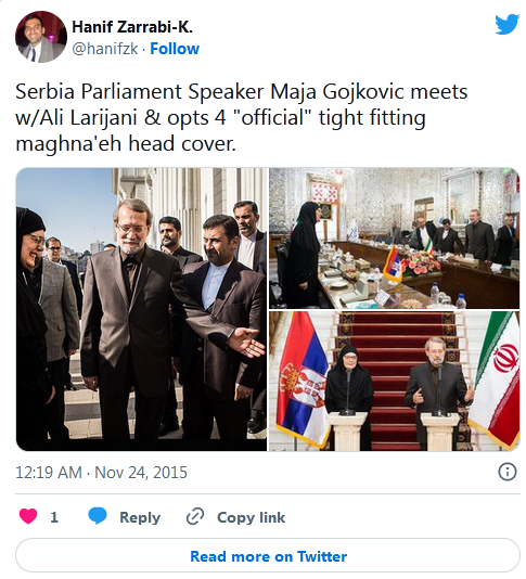 Tokom posjete Iranu krajem 2015. godine, tada predsjednica parlamenta Srbije Maja Gojković, nosila je hidžab.