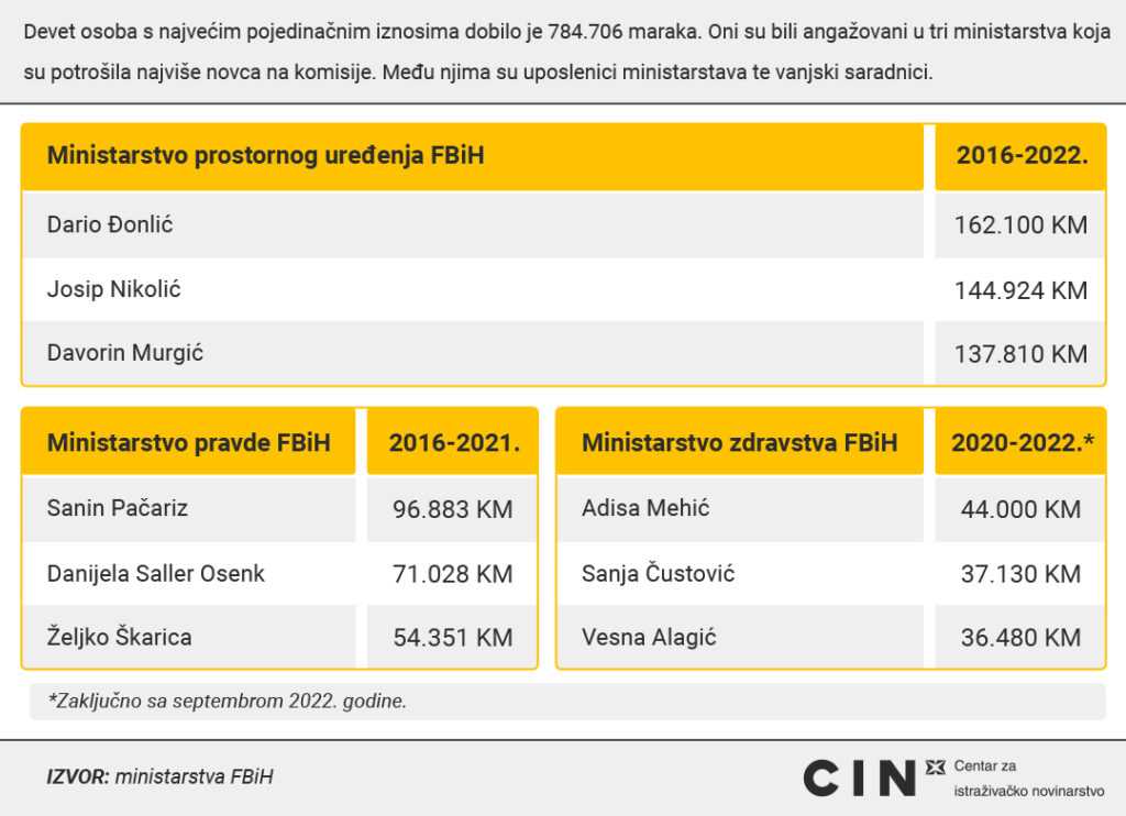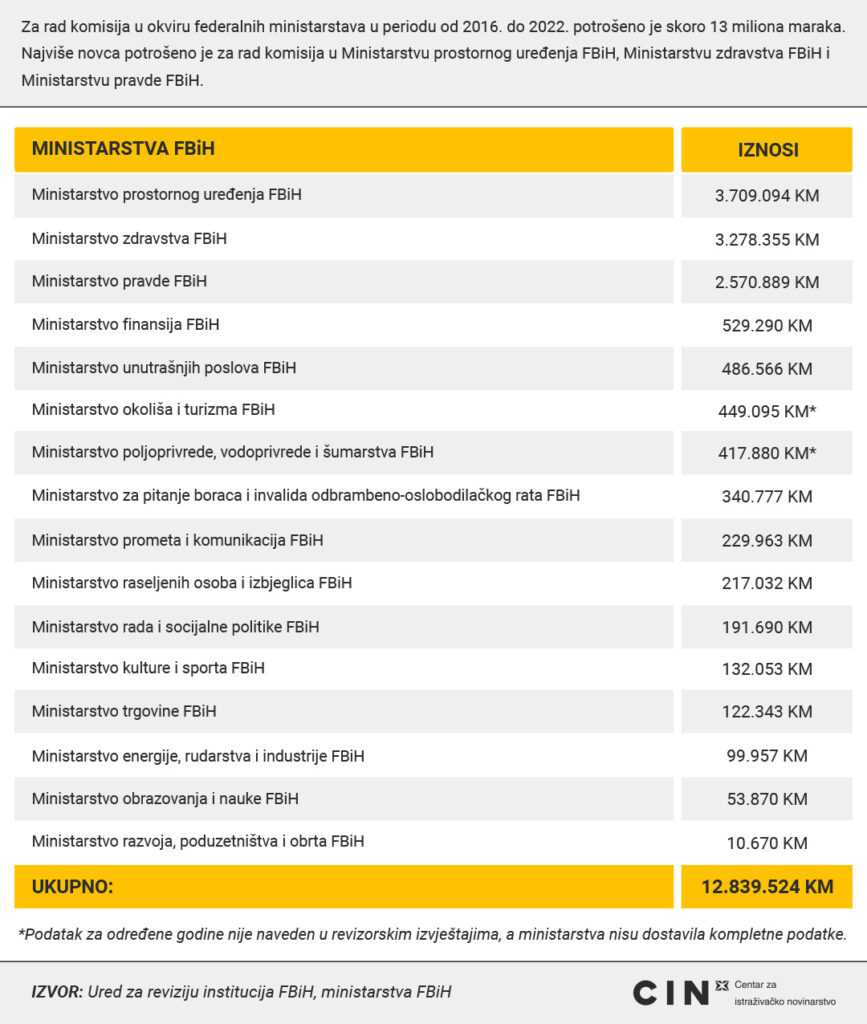 Šesnaest ministarstava Federacije Bosne i Hercegovine potrošilo je 12,8 miliona KM kako bi platilo članove komisija i radnih tijela od 2016. do 2022. godine. Novac je dobilo 2.026 osoba. Njihove zarade kretale su se od nekoliko stotina do više od sto hiljada maraka, piše Centar za istraživačko novinarstvo CIN.