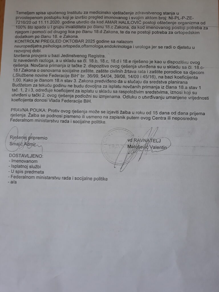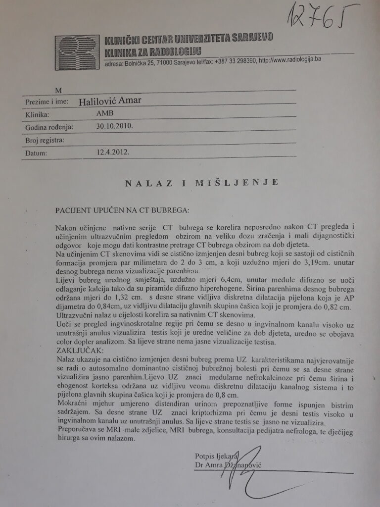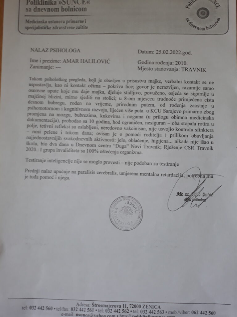Do sada je liječen više puta u KCU Sarajevo zbog promjena na mozgu, bubrezima, kukovima i nogama. Prve korake napravio je u 10 godini. Hoda ograničeno i nesigurno, refleksi oslabljeni. Nosi pelene i tokom dana. Ovisan je o drugom licu kada jede, kada se oblači i kada se kupa-higijena. U školu nije išao, samo u centar Duga u Travniku. Nalaz upućuje na paralysis cerebralis. Umjereno je retardiran. Potrebna mu je tuđa pomoć i njega. Radio je i operaciju lijevog stopala u Travniku. Zaostaje u razvoju. U drugoj godini počinje njegovo aktivno liječenje i traje sve do danas, tada su uočene ciste na bubrezima. Živi sa majkom i sestrom. Otac ih je napustio. Sve troje žive od Amarove invalidnine 109,76 KM i dodatka za njegu i pomoć 274,40 KM sve ukupno isnosi 384,16 KM. Doktori smatraju da Amar može i dalje napredovati ako se bude liječio, da poboljša hodanje i govor.