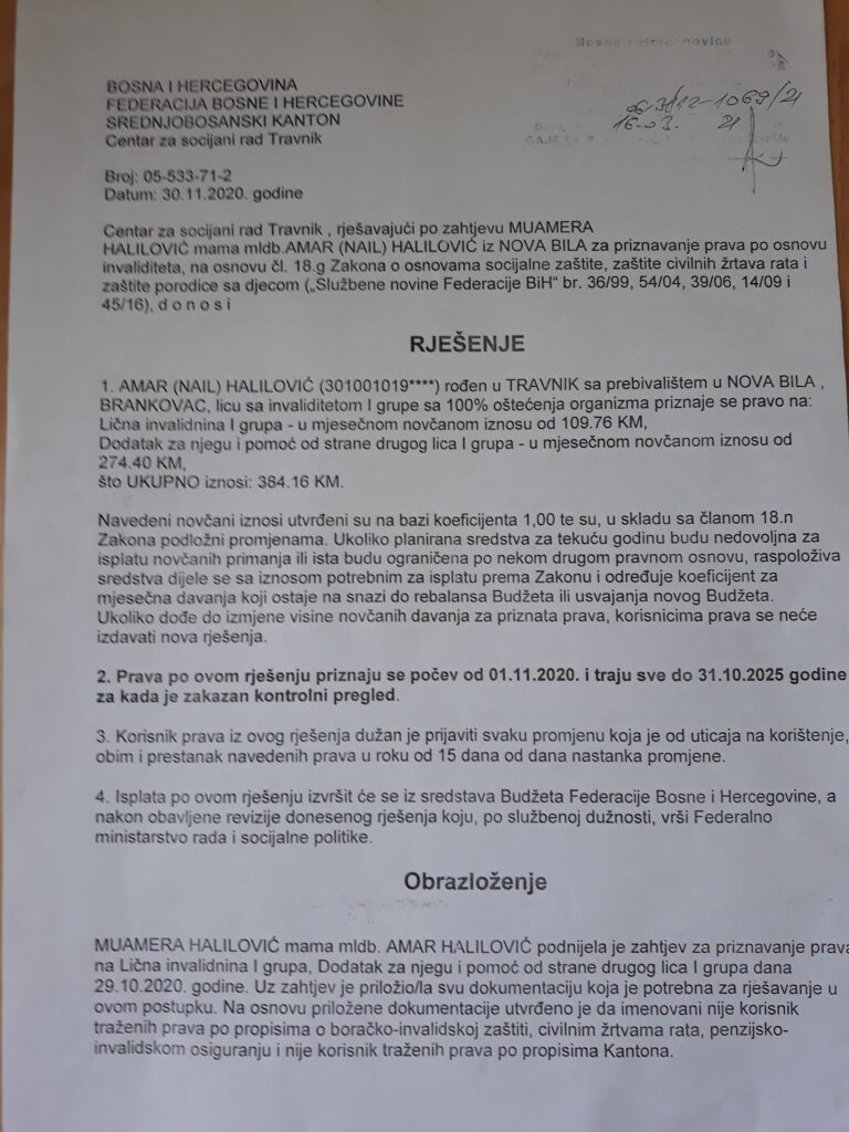Amar Halilović rođen je 30.10.2010. godine u Travniku. Amar je 100% invalid. Prilikom poroda pukao mu je želudac i čim se rodio imao je prvu operaciju želuca. Amar je dijete rođen sa autizmom. Od rođenja zaostaje u psihomotornomi i kognitivnom razvoju. Kada se kontaktira sa Amarom ne može se uspostaviti govorni kontakt, kao ni kontakt očima. Prilikom kontakta pokriva lice, a govor Amarov je nerazumljiv. Amar samo razumije osnovne upute koje mu daje majka. Stidljivo je i povučeno dijete. Kada je majka uz njega osjeća se sigurno.