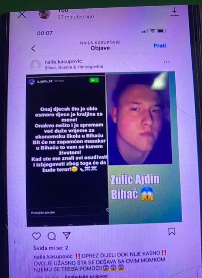Na društvenim mrežama pojavila se objava dječaka iz Bihaća koji prijeti da će počiniti masakr u školi kao u Srbiji, piše 072info.