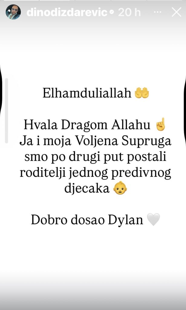 Inače, Dino se oženio s2024. godine u Švaicarskoj, a vrlo brzo je postao i otac. Prije godinu dana na svijet je stigao Noah, a sada je dobio još jednog sina.