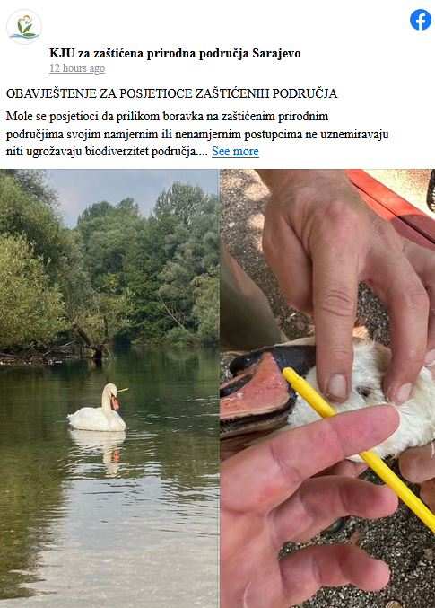 – Mole se posjetioci da prilikom boravka na zaštićenim prirodnim područjima svojim namjernim ili nenamjernim postupcima ne uznemiravaju niti ugrožavaju biodiverzitet područja. Na prostoru Spomenika prirode “Vrelo Bosne” neodgovorni pojedinci su povrijedili jednog labuda. Labud (Cygnus olor lat.) je vrsta koja je simbol ovoga područja. Prostor koji naseljavaju je njihovo prirodno stanište. KJU za zaštićena prirodna područja se brine da ove vrste ptica kao i pripadnici svih drugih vrsta i skupina organizama imaju adekvatnu zaštitu shodno pravnim aktima po kojima upravljamo.