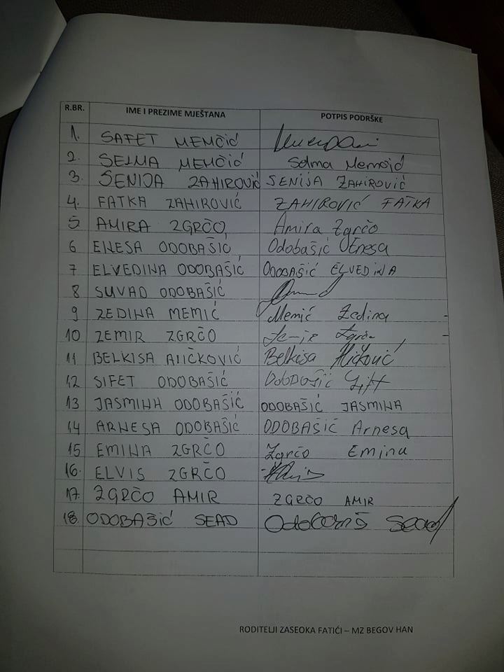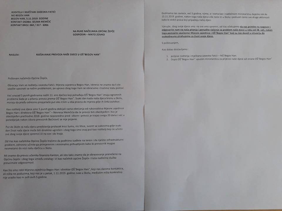 U pismu načelniku Općine Žepče navode sljedeće„Vjerujte, zbog svoje djece smo na sve smo spremni, od Vas očekujemo da nas primite na razgovor i odgovorite nam na naša pitanja i ponudite rješenje za problem naše djece u roku od 48. sati, nakon toga postajete saučesnici lokalne vlasti Mjesne zajednice Begov Han i OŠ“Begov Han“ koji su nas doveli u situaciju da svakodnevno strahujemo za život svoje djece“, stoji u dopisu kojeg su roditelji poslali načelniku Općine žepče, gospodinu Mati Zovki.