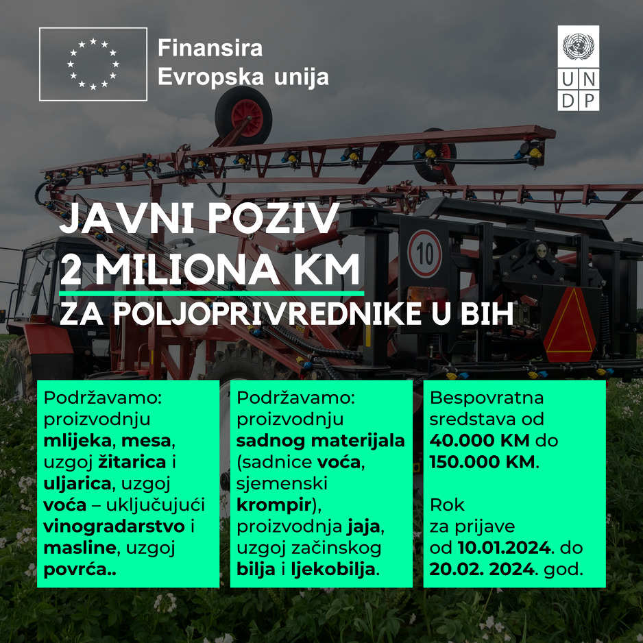 U okviru projekta EU4AGRI, koji finansira Evropska unija, 15. decembra objavljen je novi Javni poziv vrijedan 2 miliona KM za mjeru podrške investicijama u primarnu poljoprivrednu proizvodnju.