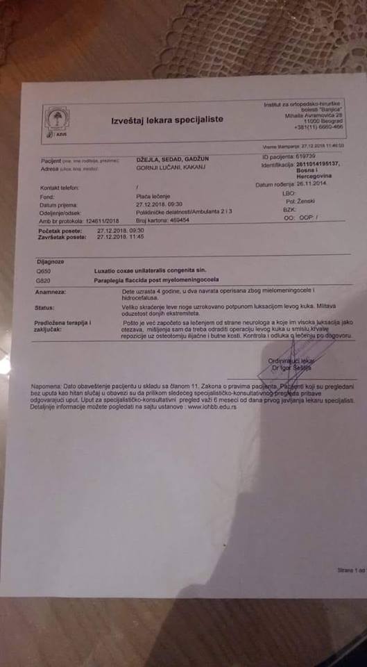 U bolnici, u Beogradu se moće uraditi operacija da bi naša djevojčica mogla prohodati.