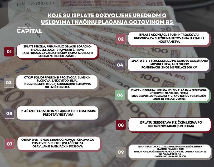 Naime, Uredba o uslovima i načinu plaćanja gotovinom RS kaže da poslovni subjekti mogu plaćati gotovim novcem, odnosno vršiti isplate sa svog računa za sljedeće namjene: