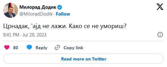 – Crnadak, ‘ajd ne laži. Kako se ne umoriš? – napisao je Dodik.
