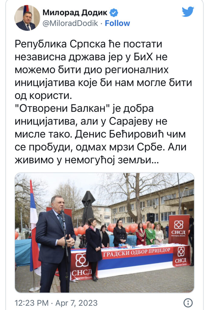 “Bošnjački član Predsjedništva BiH Denis Bećirević čim se ujutri probudi, odmah mrzi Srbe. Ali živimo u takvoj zemlji, u kojoj se neke ambasade vježbaju na nama, ali i to će proći jednog dana”, naglasio je Dodik.