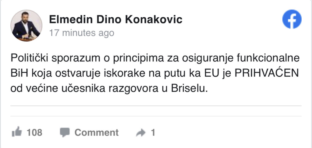 Kako javljaju izvori “Avaza”, u Briselu na sastanku bh. lidera političkih stranaka sa predsjednikom Evropskog vijeća Šarlom Mišelom (Charles Michel) i visokim predstavnikom EU Žozepom Boreljom (Josep Borell) dokument je prihvaćen kao politička izjava a ne kao sporazum kako je ranije bilo ponuđeno zvaničnicima iz BiH.