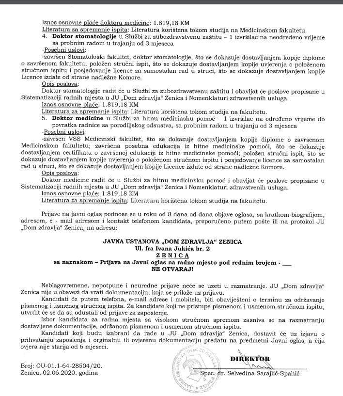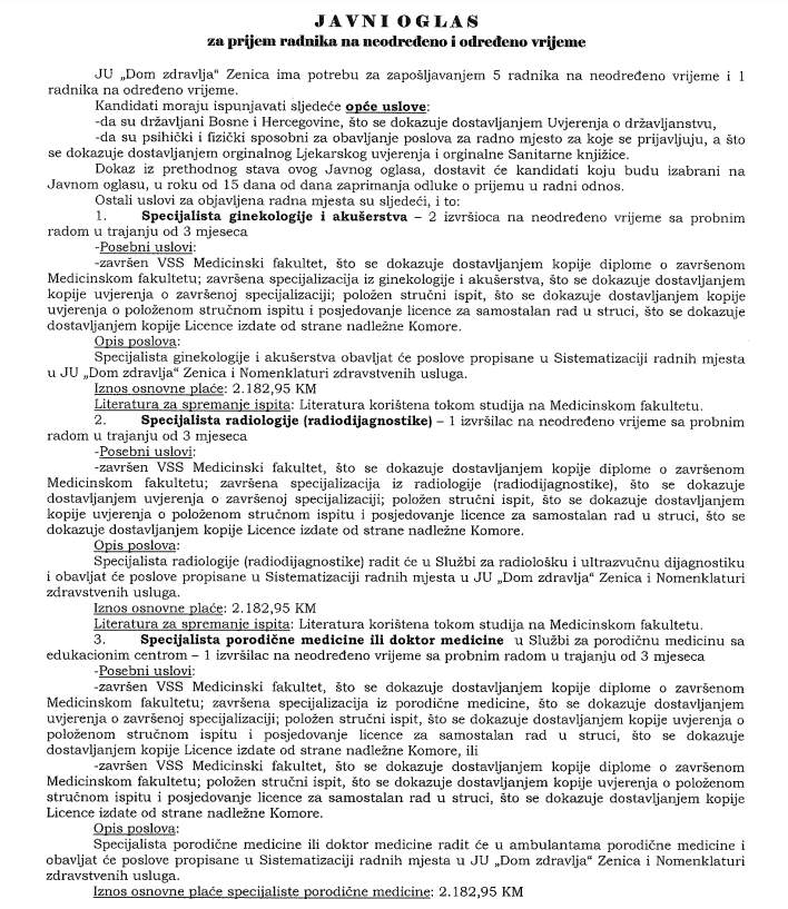 Javna ustanova Dom zdravlja Zenica raspisala je Javni oglas za prijem radnika na neodređeno i određeno vrijeme i to pet radnika.