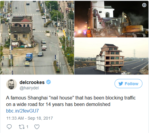 Ova konkretna kuća u Šangaju je blokirala saobraćajnicu od četiri trake koja je na tom dijelu morala biti sužena na dvije trake. Kako pišu kineski državni mediji, kuća je srušena tokom noći za samo 90 minuta.