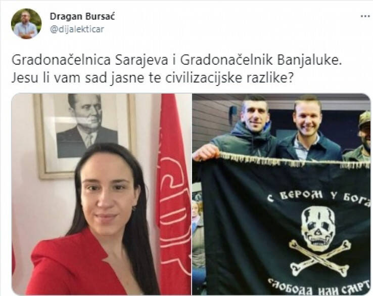 Poredeći fotografiju sarajevske gradonačelnice Benjamine Karić na kojoj pozira ispred portreta Josipa Broza Tita s fotografijom Draška Stanivukovića koji pozira s četničkom zastavom, Bursać je napisao: