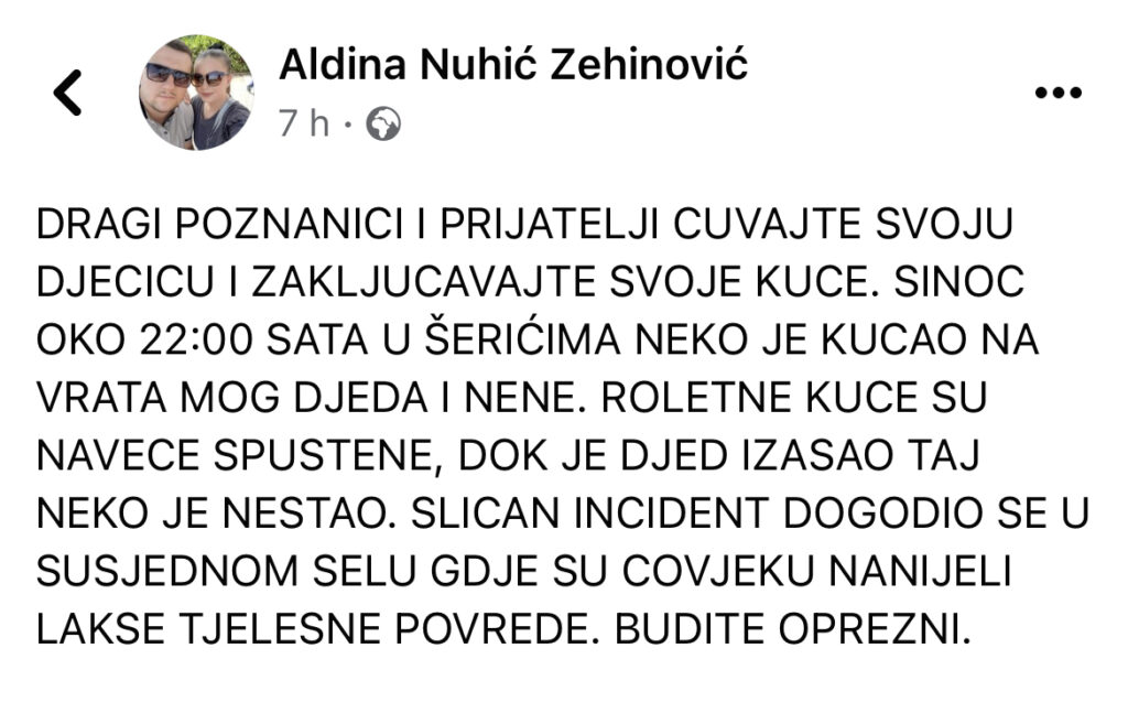 “Dragi poznanici i prijatelji, čuvajte svoju dječicu i zaključavajte vrata svoje kuče. Sinoć oko 22:00 sata u Šerićima neko je kucao na vrata mog djeca i nene. Roletne kuće su navečer spuštene, dok je djed izašao taj neko je nestao. Sličan inicident dogodio se u susjednom selu gdje su čovjeku nanijeli lakšte tjelesne povrede. Budite oprezni.”