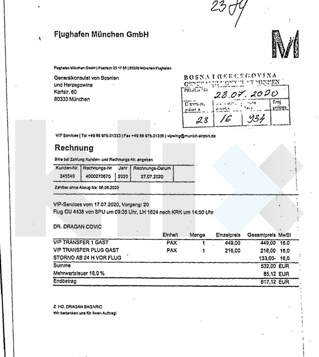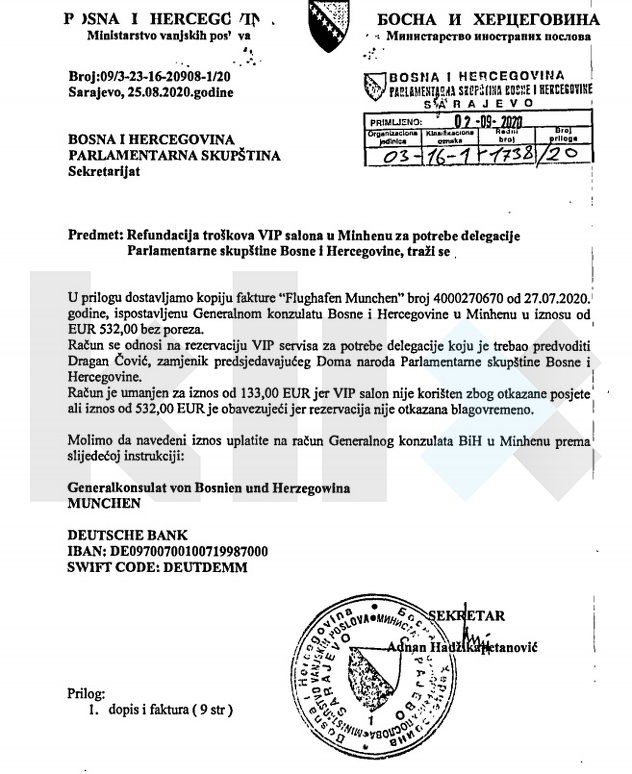 “Račun se odnosi na rezervaciju VIP servisa za potrebe delegacije koju je trebao predvoditi Dragan Čović, zamjenik predsjedavajućeg Doma naroda Parlamentame skupštine Bosne i Hercegovine. Račun је umanjen za iznos od 133 eura јег VIP salon nije korišten zbog otkazane posjete ali iznos od 532, eura je obavezujući јег rezervacija nije otkazana blagovremeno”, kaže se u dopisu Ministarstva vanjskih poslova BiH Sekretarijatu Parlamenta BiH.