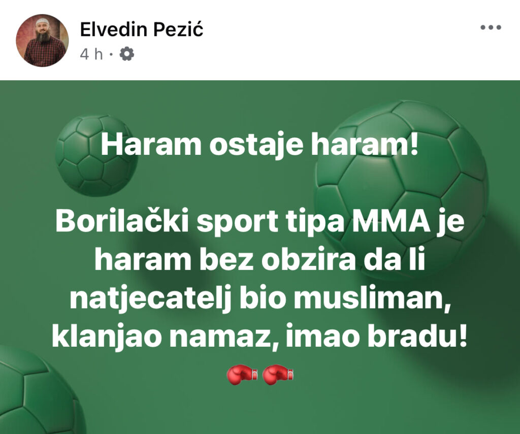 “Haram ostaje haram! Borilački sport tipa MMA je haram bez obzira da li natjecatelj bio musliman, klanjao namaz, imao bradu!” – izjavio je Pezić na Facebook-u.