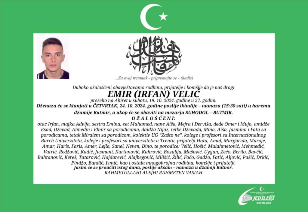 -Momak je bio predivan, u vjeri, lijepog ponašanja, magistar nauka, svojim roditeljima poslušan. Mnogi ljudi žale za njim, što govori o njegovoj dobroti. Allah da mu se smiluje. Sutra je dženaza u Butmiru, poslije ikindije namaza. Ostala je iza njega tugom shrvana porodica, rodbina i prijatelji. Allah mu lijepi džennet podario, a porodici i svima nama sabri džemil! Allahumme amin! Doista, mi smo Allahovi i, doista, mi se Njemu vraćamo! – napisao je Velić.