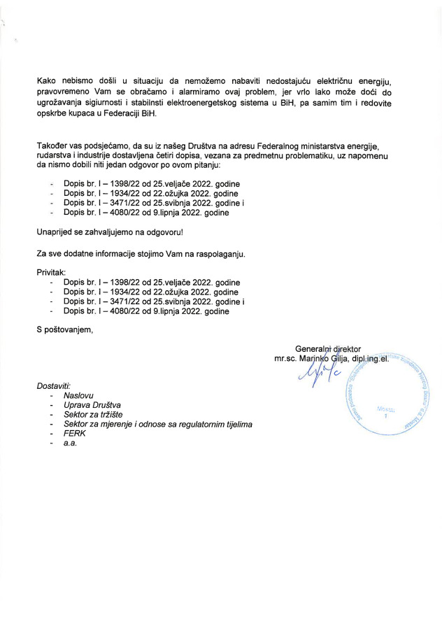 Kako kažu u dopisu, JP “Elektroprivreda HZ Herceg Bosne” d.d. Mostar je ušla u period kada je uredno snabdijevanje naših potrošača polako postlo upitno, kako potrošača iz kategorije univerzalne usluge tako i potrošača iz kategorije tržišne ponude.