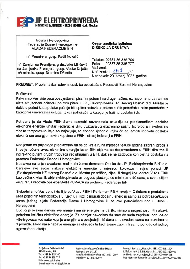 Slijedom navedenog, želim da donesete odluku da Elektroprivreda BIH Sarajevo ponudi sve svoje pozive za električnu energiju u mjesecu augustu i septembru Elektroprivredi HZHB po tržišnoj ili drugoj cijeni koju odredi Vlada FBiH kao većinski vlasnik obje elektrane sa odgodom plaćanja od najmanje 90 dana, a sve u cilju osiguranja redovnog snabdijevanja svih kupaca na području Federacije BiH”, navode iz Elektroprivrede HZHB.