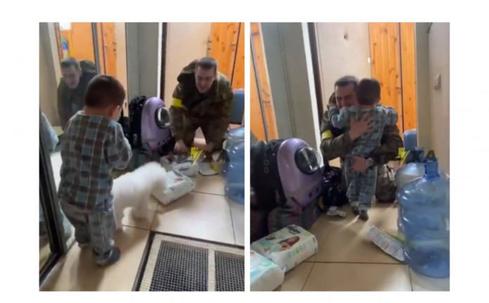 Vojnom osoblju u Ukrajini dopušteno je vratiti se nakratko s ratišta svojim najmilijima kako bi im donijeli osnovne potrepštine, a tata u videu porodici je dostavio pelene prije nego što je pružio ruke prema sinu.