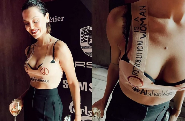 Trake koje služe za oblikovanje dekoltea Erna je ovaj put iskoristila za nešto drugačiju namjenu, napravivši top na kojem je ispisala natpise podrške: “Revolution is a Woman”, što bi u prijevodu bilo “Revolucija je žena”, hashtag #Afghanwomen uz dva znaka “peace”.