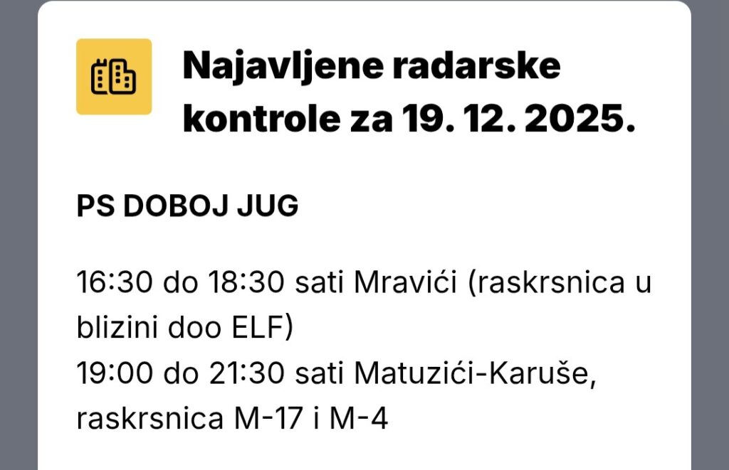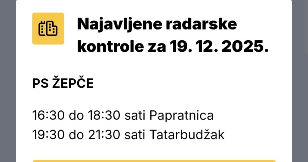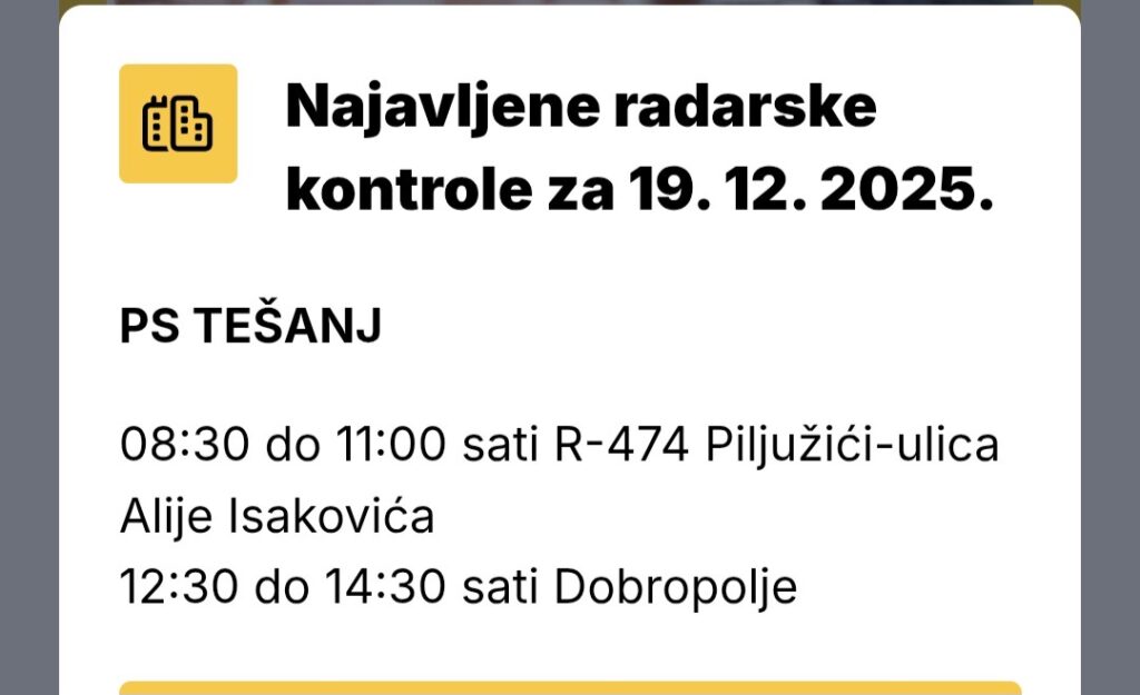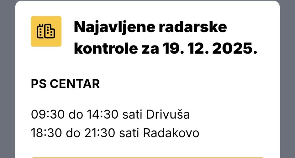 Evo najavljenih radarskih kontrola za 19.12.2025. po policijskim stanicama — prema rasporedu sa sajta BIHAMK-a (informativne kontrole brzine kretanja vozila):