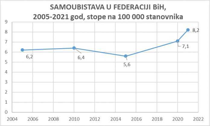 Prema podacima Zavoda za javno zdravstvo Federacije BiH u 2021. godini registrovano je ukupno 177 slučajeva suicida, sa stopom 8,2/100.000. Samoubistva spadaju u vodeće nasilne smrti u FBIH sa 38,1% zastupljenosti u nasilnim smrtima, nakon toga slijede zadesi ili nesretni slučajevi, i smrti nastale uslijed saobraćajnih nesreća.