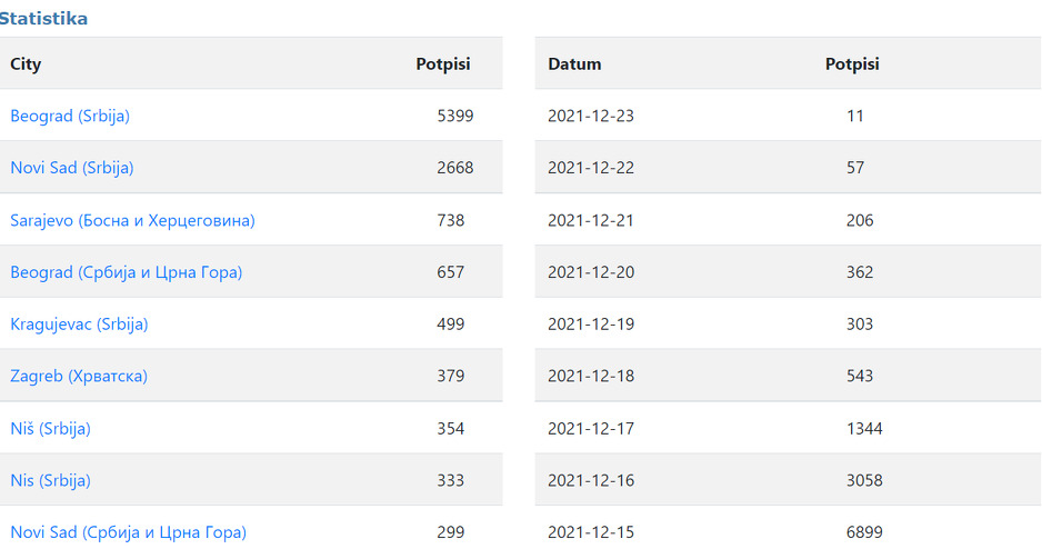 Najviše potpisa stiglo je iz Beograda, njih preko pet hiljada. Na drugom mjestu je Novi Sad gdje je ovu peticiju potpisalo preko dvije hiljade građana, a u samom vrhu, odnosno na trećem mjestu je i Sarajevo s preko 700 potpisa.