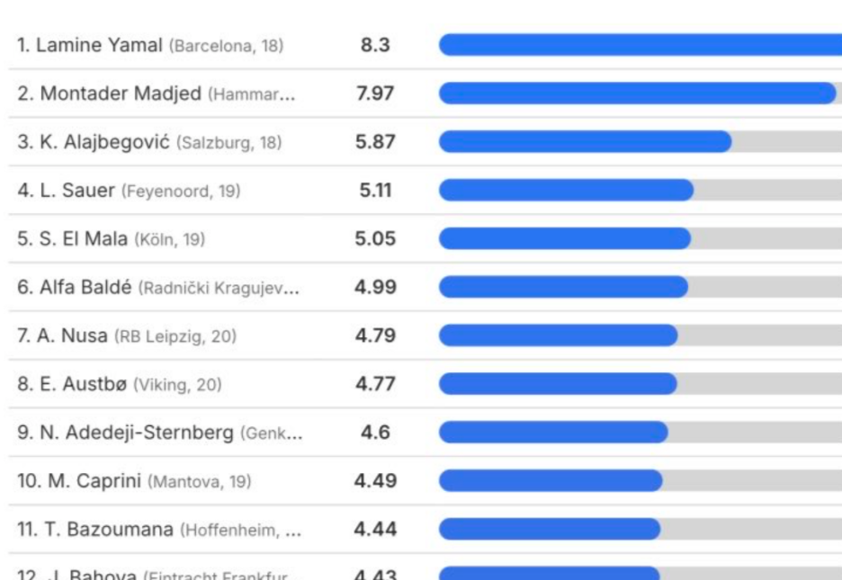 Taj podatak ga svrstava na drugo mjesto na svijetu za igrače ispod 21 godine. Samo su Lamine Yamal iz Barcelone i Montader Madjed iz Hammarbyja ispred Alajbegovića, što dovoljno potvrđuje da se radi o talentu svjetske klase.