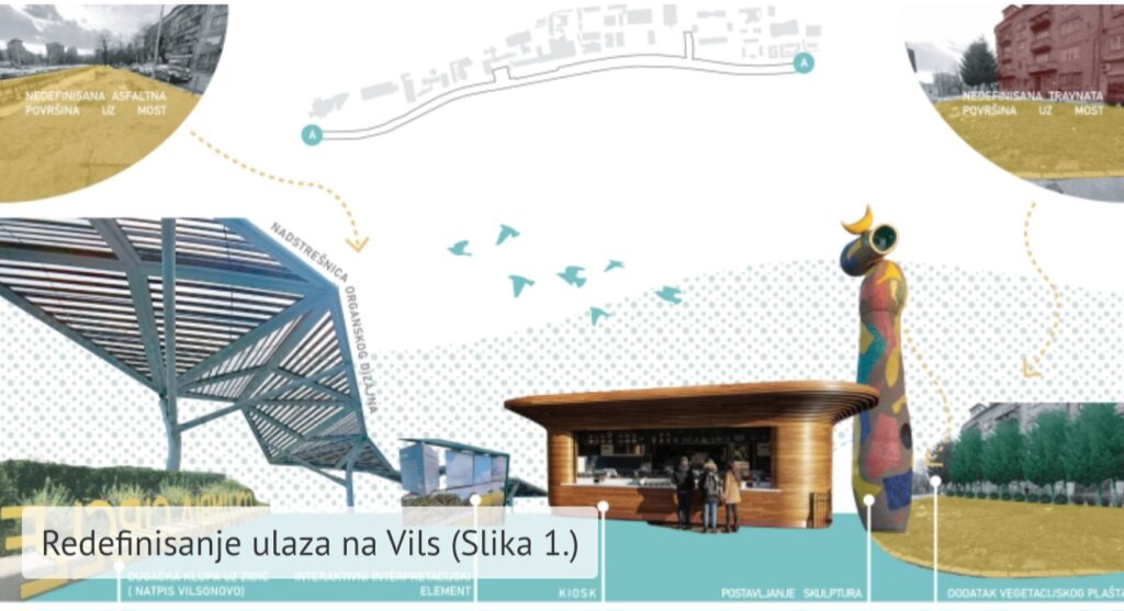 Postojeći zidić/ograda rijeke bi se mogao transformirati u dugačku klupu ispod nadstrešnice, a naslon osmisliti u vidu tipografije sa natpisom: “VILSONOVO ŠETALIŠTE”, koja će se prelijevati od naslona do sjedišta.