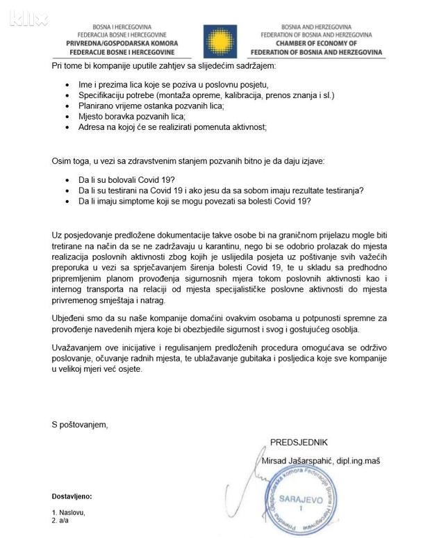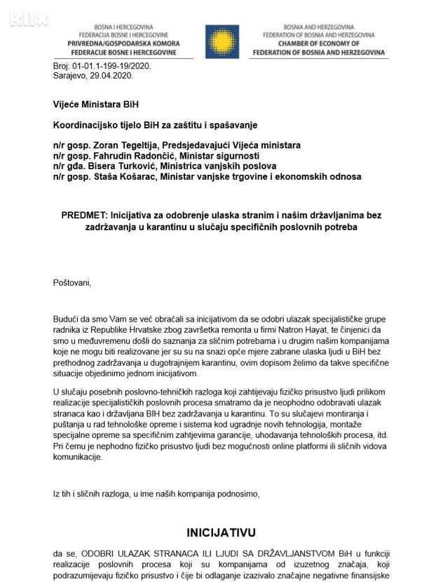 Privredna komora Federacije BiH uputila je Vijeću ministara BiH inicijativu za odobrenje ulaska stranim i našim državljanima bez zadržavanja u karantinu u slučaju specifičnih poslovnih potreba. Brojni poslovni subjekti kao što su Autoceste FBiH, Elektroprivreda, Stanić Group i mnogi drugi bilježe velike gubitke zbog otežanog ulaska stranaca, ali i naših građana u zemlju, uslovljenih mjerama za suzbijanje pandemije koronavirusa.