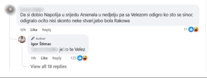“Da si dobio Napolija u srijedu, Arsenala u nedjelju, pa sa Veležom odigrao kao što se sinoć odigralo, očito nisi skontao neke stvari”, stoji u poruci Štimcu, na što je nekadašnji hrvatski nogometaš kratko i vulgarno rekao: “Je.. te Velež”.