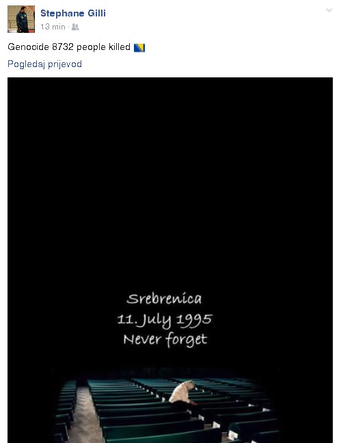 – Genocid, ubijene 8.732 osobe – kratko ja napisao Gilli, dok je uz objavu postavio zastavu Bosne i Hercegovine i ružu, čime je odao počast nastradalim