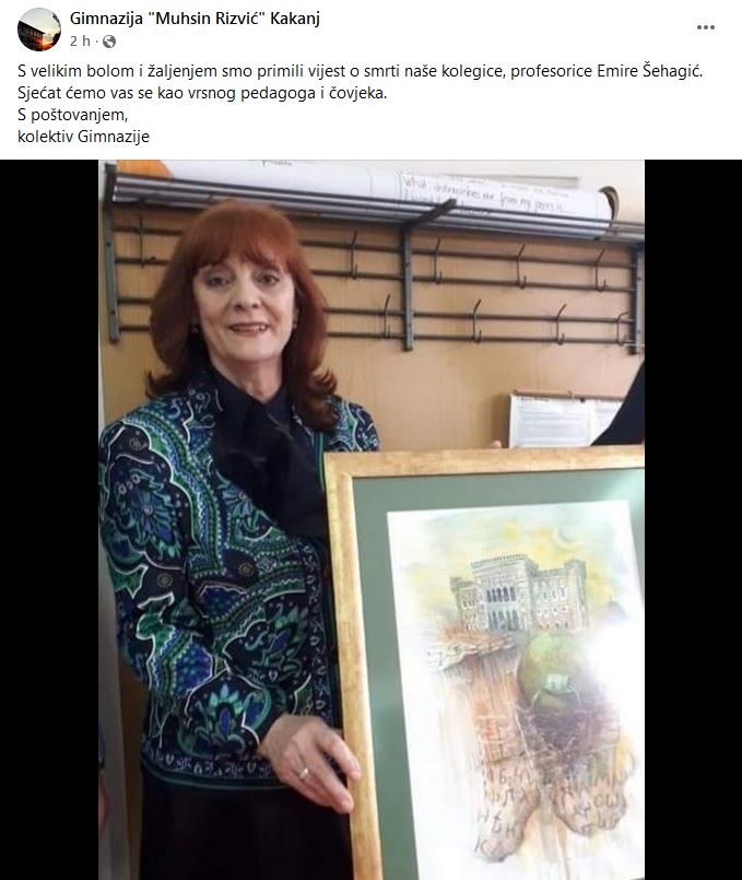 • S velikim bolom i žaljenjem smo primili vijest o smrti naše kolegice, profesorice Emire Šehagić. Sjećat ćemo vas se kao vrsnog pedagoga i čovjeka. S poštovanjem, kolektiv Gimnazije – stoji u objavu na Facebook stranici kakanjske Gimnazije.