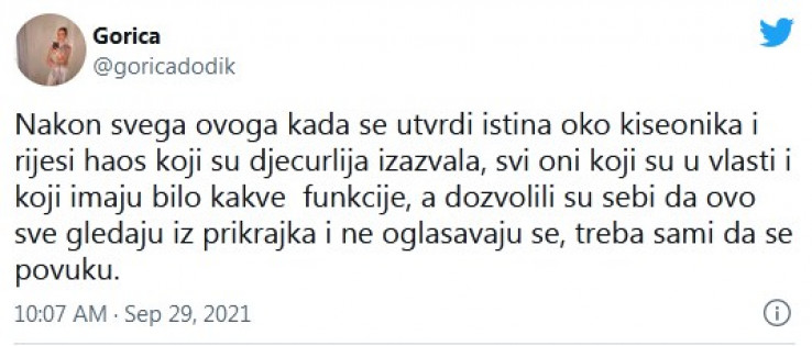 – Nakon svega ovoga kada se utvrdi istina oko kiseonika i riješi haos koji su dječurlija izazvala, svi oni koji su u vlasti i koji imaju bilo kakve funkcije, a dozvolili su sebi da ovo sve gledaju iz prikrajka i ne oglašavaju se, treba sami da se povuku, napisala Gorica Dodik.