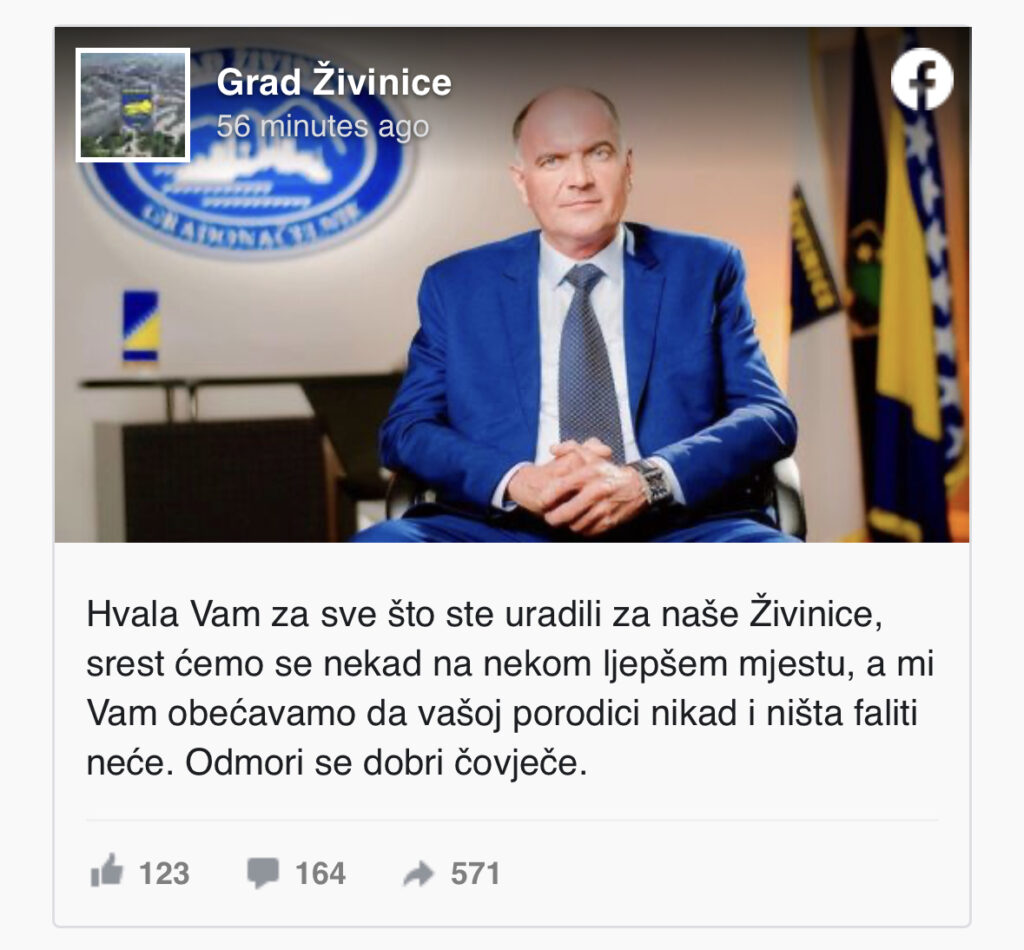 Na Facebook stranici Grada Živinica također se pojavila oproštajna poruka.