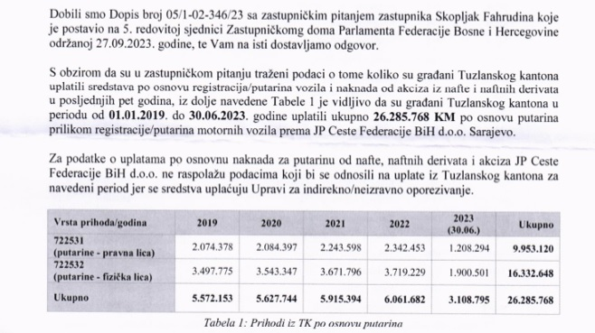 Iz džepa građana Tuzlanskog kantona za nešto više od četiri godine, preciznije od 1. januara 2019. do 30. juna 2023. godine, država je uzela 26,2 miliona KM po osnovu putarina prilikom registracije vozila i putarina motornih vozila.