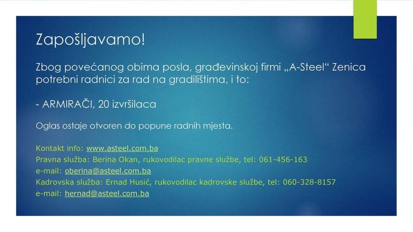 Zbog povećanog obima posla, građevinskoj firmi “A-Steel” Zenica potrebni radnici za rad na gradilištima, i to: