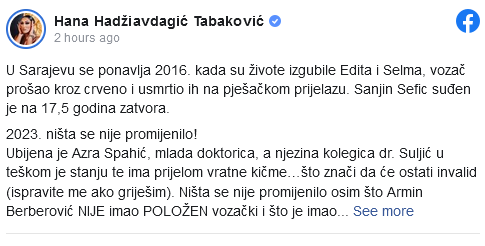 Sarajevska influencerica Hana Hadžiavdagić Tabaković podijelila je status na Facebooku vezanu za sinoćnju tragediju u naselju Marijin Dvor, kada je pijani vozač Armin Berberović usmrtio mladu doktoricu Azru Spahić i povrijedio dvije osobe.
