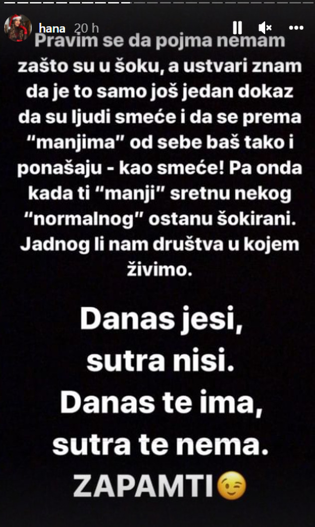 “One se unezgodile jer ja kao želim da uđem pa žureći iskrcavaju to sve. Ja im kažem da uspore i još im pomognem do sredine hodnika. One u šoku. Pravim se da ne znam zašto su u šoku, a u stvari znam da je to samo još jedan dokaz da su ljudi smeće i da se prema “manjima” od sebe baš tako i ponašaju – kao smeće. Pa onda kad ti “manji” sretnu nekog normalnog ostanu šokirani. Jadnog li nam društva u kojem živimo. Danas jesi, sutra nisi. Danas te ima, sutra te nema. Zapamti”, poručila je Hana.