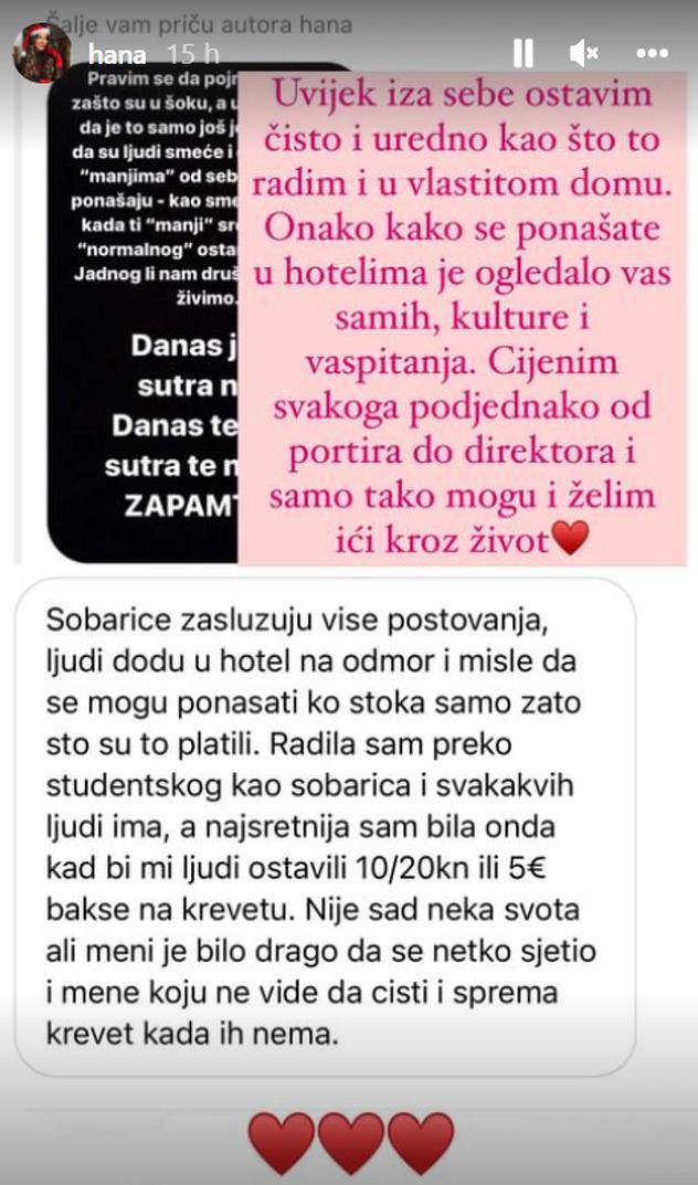 Naime, kako je objasnila na svom Instagram storyju mlade sobarice su se jako unervozile kad je Hana trebala ući u lift u kojem su i one bile s puno stvari poput usisivača, kolica i vreća s prljavim ručnicima.