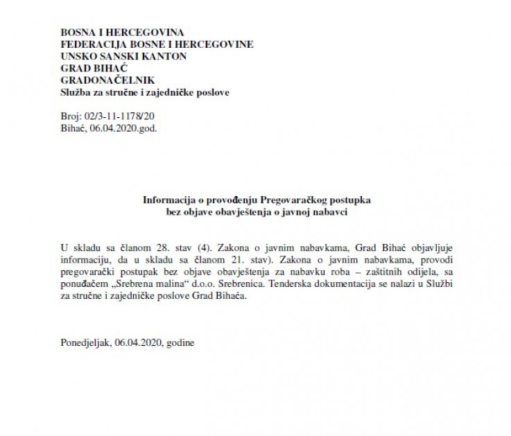 Naime, ime ove firme našlo se i pod lupom Agencije za javne nabavke i Tužilaštva USK kada je riječ nabavci zaštitnih odijela za potrebe Grada Bihaća, a odluka o nabavci objavljena je 6. aprila.