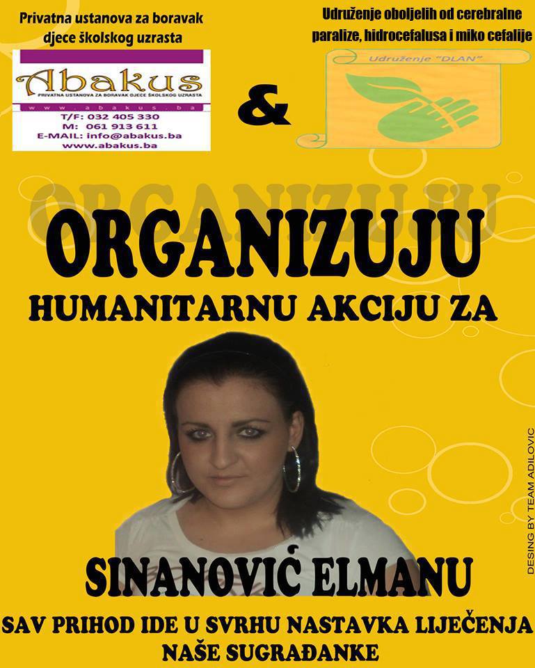 PU Abakus Zenica i udruženje Dlan Zenica organizuju humanitarnu akciju za liječenje naše sugrađanke Elmane Sinanović. Humanitarna akcija će obuhvatiti prodaju kolačića i dječijih ručnih radova.